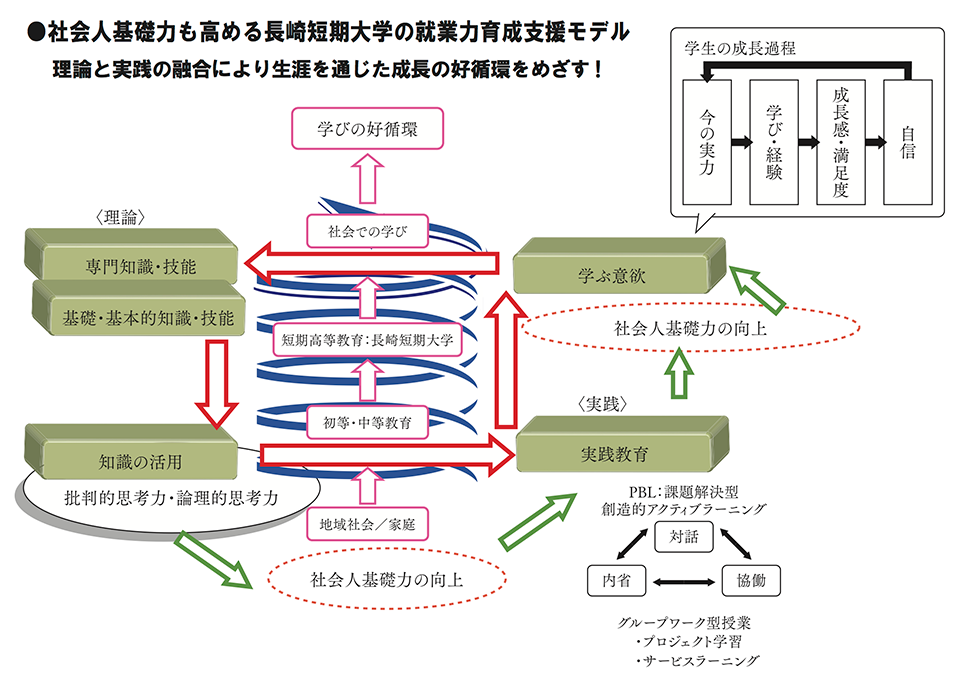 社会人基礎力の向上が専門知識、基礎学力への習得の意欲につながり、逆に専門知識・基礎学力が一定レベルに達した後、社会人基礎力の向上が問題解決力、チームワーク、リーダーシップなどの育成を通して促されれば、当然、専門知識・基礎学力も問題解決プロセスを経験することで再構成され、一段と高まったものになるはずです。したがって、本学では社会人基礎力の育成として、問題解決場面や集団でのふるまいが求められる場面を設定すると同時に個人中心の専門知識・基礎学力を高める場面を設定して、学びの好循環を生む教育体制を整えています。