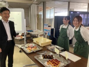 2年生16名は、この日のために2回の試作を経て、22品のお菓子やパンを製造しました。前日の仕込みから当日の提供まで、お客様に思いを寄せ丁寧に製造している姿はまさに職人です。すべてのお客様にご試食いただけるよう、サイズ感や味わいも工夫した結果、来場いただいた皆様からのお褒めの言葉に2年間の成長を感じるイベントとなりました。