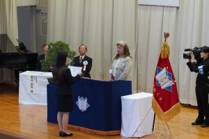 これを受け、国際コミュニケーション学科の美吉田 早紀さんが新入生代表宣誓を行い、これからの決意表明と学生の本分を尽くすことを誓いました。