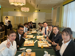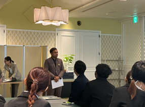 研修ではまず、ホテルのランチビュッフェを楽しみながら料理やサービスについて実際に体験した後、業務部業務課の方より、ホテルで働くことの意義や外国人の採用状況等について詳しく教えていただきました。