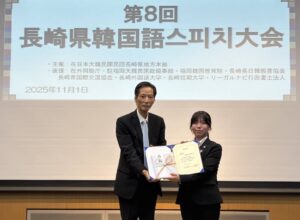 令和7年11月1日(土)に長崎市立図書館で「第8回長崎県韓国語スピーチ大会」が開催され、本学からは、スピーチ部門に1名、暗唱部門に1名が参加しました。