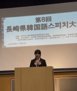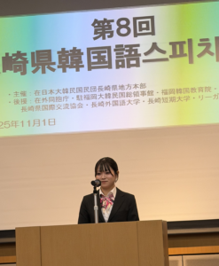 令和7年11月1日(土)に長崎市立図書館で「第8回長崎県韓国語スピーチ大会」が開催され、本学からは、スピーチ部門に1名、暗唱部門に1名が参加しました。