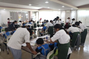 活動当日は、「お菓子作りの楽しさ」や「作ることの喜び」を感じてもらえるよう、学生たちが各テーブルにつき、児童一人ひとりに寄り添いながら丁寧にサポート。最初は少し緊張していた児童たちも、次第に笑顔が増え、思い思いのデザインに夢中になって取り組んでいました。
