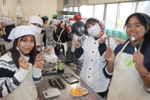 令和8年1月9日(金)、食物栄養コース2年生と国際コミュニケーションコースの留学生による合同コラボ授業として、「もちつき」の実習を行いました。
