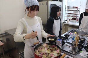 令和8年1月9日(金)、食物栄養コース2年生と国際コミュニケーションコースの留学生による合同コラボ授業として、「もちつき」の実習を行いました。