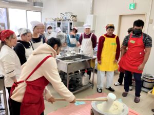 つきたてで焼きたてのお餅は格別で、きな粉や砂糖醤油など、さまざまな食べ方で味わいました。留学生の中には、お餅を食べるのが初めてという学生もおり、母国のお餅やもち米料理との違いに驚く場面も見られるなど、日本の食文化と自国の文化の違いを体験する貴重な機会となりました。